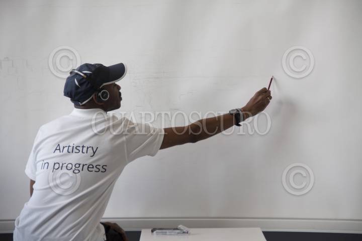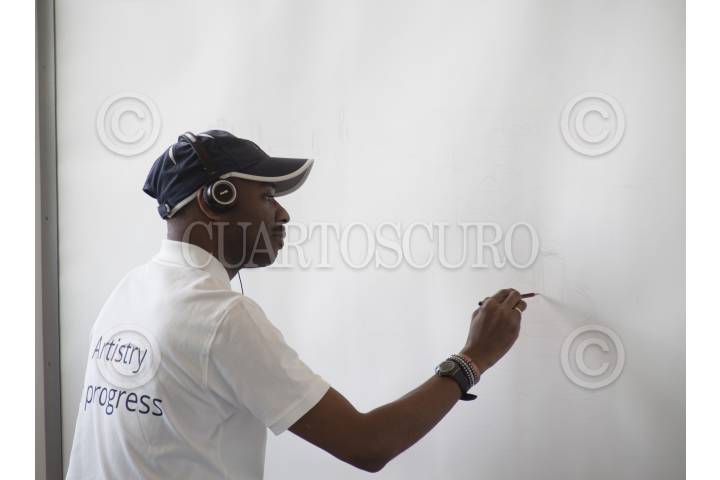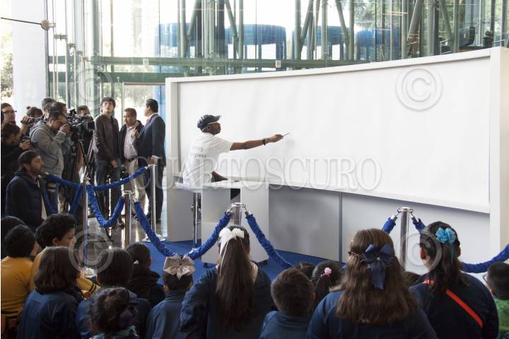 CIUDAD DE MÉXICO, 24OCTUBRE2016.- En el lobby de la torre Bancomer, el pintor inglés Stephen Wiltshire realizó sus primeros trazos en el lienzo donde dibujará a la Ciudad de México. El artista se dedica a pintar paisajes urbanos. Comentó que espera terminar el dibujo el próximo viernes. FOTO: ANTONIO CRUZ /CUARTOSCURO.COM