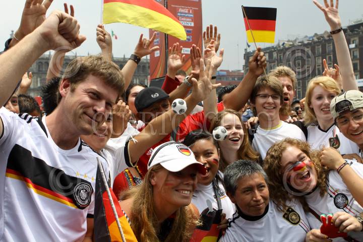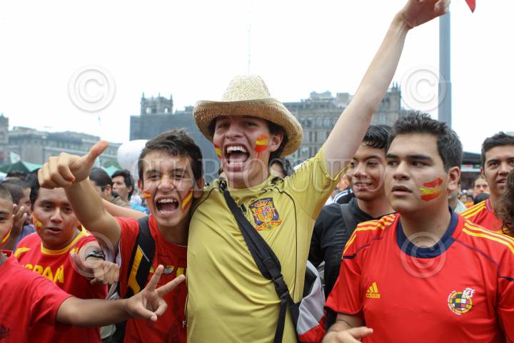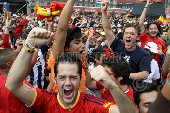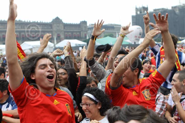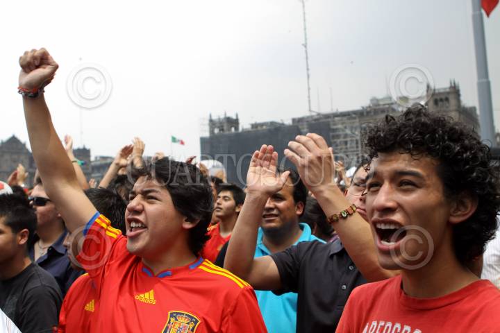 MÉXICO, D.F., 07JULIO2010.- Cientos de aficionados de España y de Alemania acudieron el FIFA Fan Fest en el Zócalo de la ciudad a ver el partido de semifinal entre dichas selecciones. España venció 1 gol por 0 a Alemania por lo que aficionados de la Furia Roja comenzaron a festejar. FOTO: RODOLFO ANGULO/CUARTOSCURO.COM