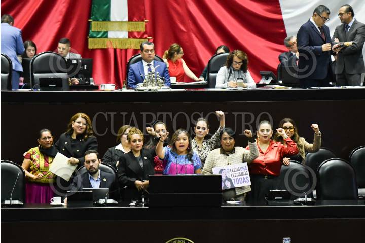 CIUDAD DE MÉXICO, 10DICIEMBRE2024.- Anais Miriam Burgos, diputada de Morena, junto a legisladoras, durante la sesión ordinaria de la Cámara de Diputados en la que se discute el dictamen de la Ley General de Acceso de las Mujeres a una Vida Libre de Violencia en materia de erradicación de la brecha salarial por razones de género. FOTO: MARIO JASSO/CUARTOSCURO.COM
