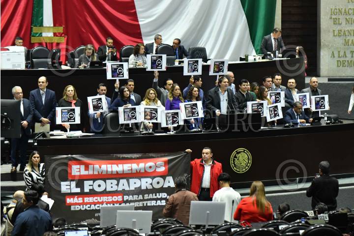 CIUDAD DE MÉXICO, 11DICIEMBRE2024.- Fidel Daniel Chimal, diputado del PAN, y sus compañeros de bancada protestan durante la sesión ordinaria de la Cámara de Diputados en la que se discute el presupuesto de egresos para el ejercicio fiscal 2025. FOTO: MARIO JASSO/CUARTOSCURO.COM