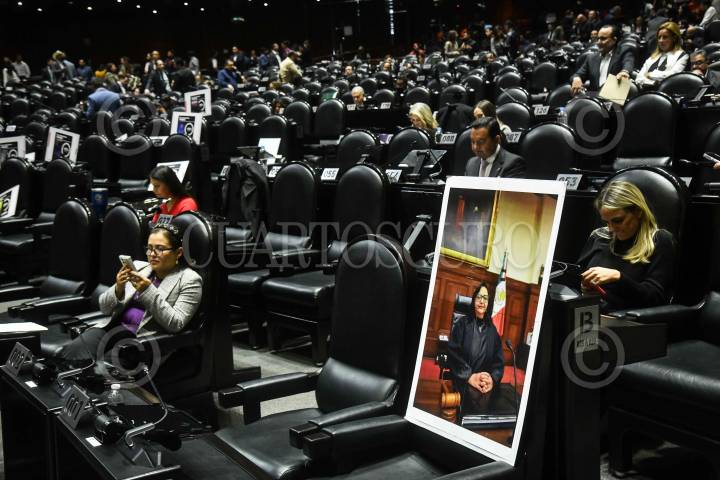CIUDAD DE MÉXICO, 11DICIEMBRE2024.- Un retrato de Norma Piña, ministra presidenta de la Suprema Corte de Justicia de la Nación (SCJN) durante la sesión ordinaria de la Cámara de Diputados en la que se discute el presupuesto de egresos para el ejercicio fiscal 2025. FOTO: MARIO JASSO/CUARTOSCURO.COM