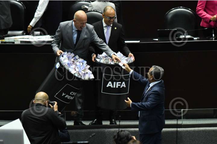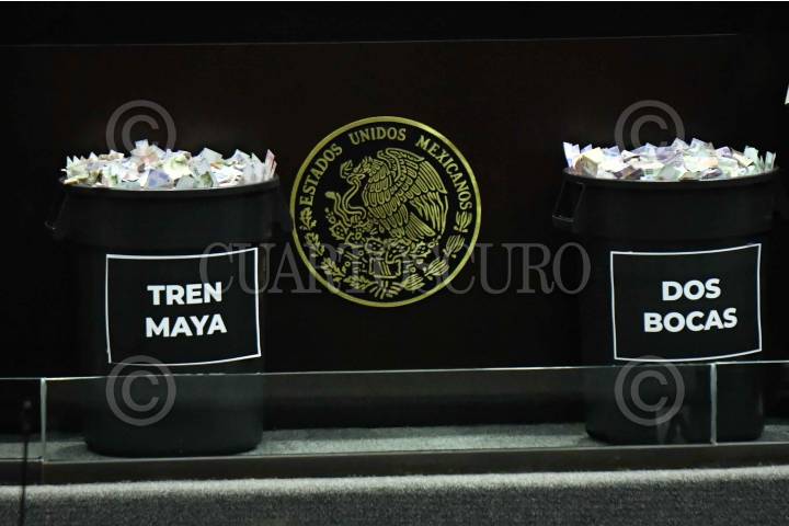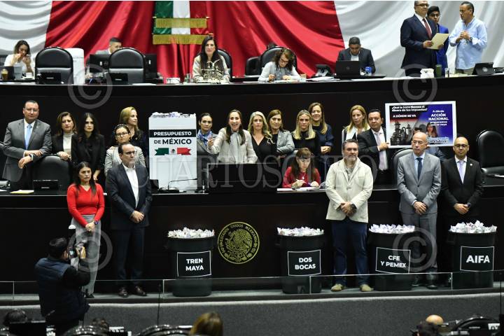CIUDAD DE MÉXICO, 11DICIEMBRE2024.- Votes de basura con billetes didácticos fueron colocados por legisladores del PAN, durante la sesión ordinaria de la Cámara de Diputados en la que se discute el presupuesto de egresos para el ejercicio fiscal 2025. FOTO: MARIO JASSO/CUARTOSCURO.COM