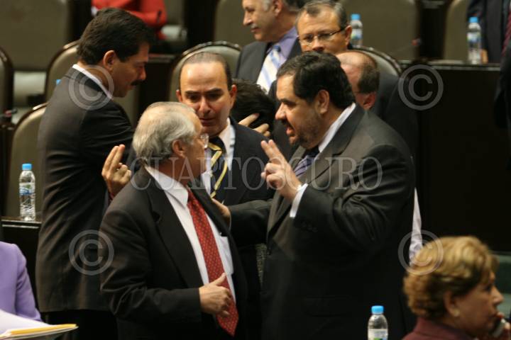MÉXICO D.F. 18OCTUBRE2007.-Los diputados del PRI, Emilio Gamboa Patrón dialógan con Jorge Chidiac diputado presidente de la Comisión de Hacienda de la Cámara de Diputados, durante la sesión donde se dictamina el presupuesto para el 2008. FOTO: GUILLERMO PEREA/CUARTOSCURO.COM