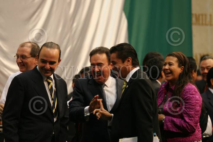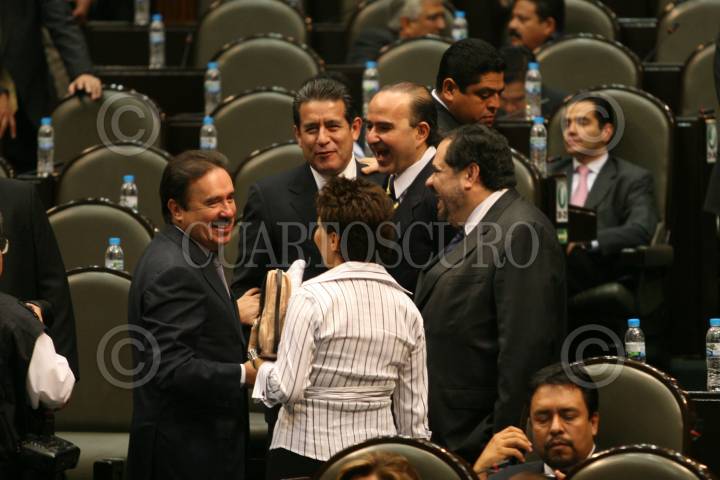 MÉXICO D.F. 18OCTUBRE2007.-Los diputados Emilio Gamboa Patrón del PRI, Juan José Rodríguez Prats, Diodoro Carrasco y Hector Larios del PAN, dialógan con Jorge Chidiac diputado del PRI y presidente de la Comisión de Hacienda de la Cámara de Diputados durante la sesión donde se dictamina el presupuesto para el 2008. FOTO: GUILLERMO PEREA/CUARTOSCURO.COM