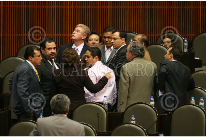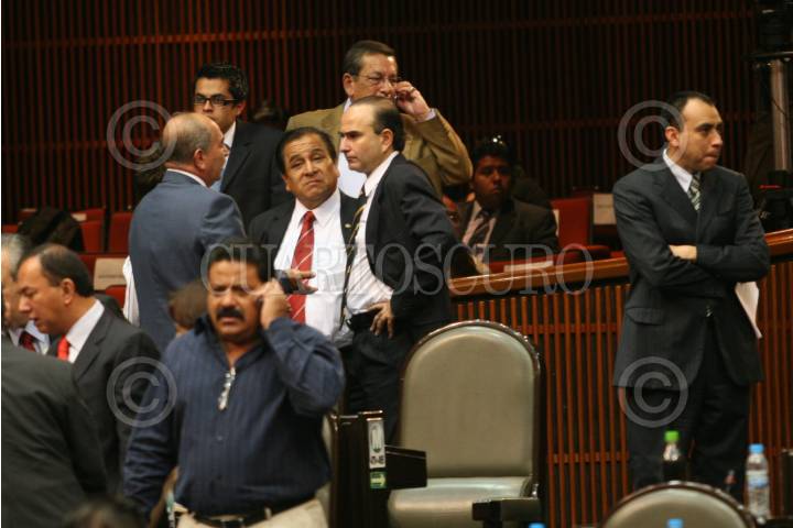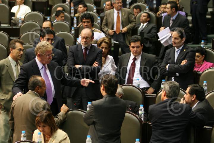 MÉXICO D.F. 18OCTUBRE2007.-Hector Larios diputado del PAN dialoga con diputados del PRD entre ellos Javier González Garza coordinador de la bancada de su partido, en la Cámara de Diputados durante la sesión donde se dictamina el presupuesto para el 2008. FOTO: GUILLERMO PEREA/CUARTOSCURO.COM