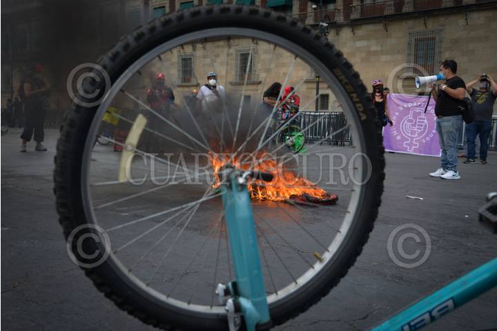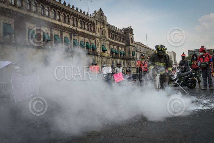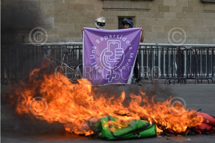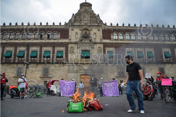 Integrantes de la organización "#NiUnRepartidorMenos" se manifestaron al exterior de Palacio Nacional para exigir a las autoridades se respeten sus derechos laborales.