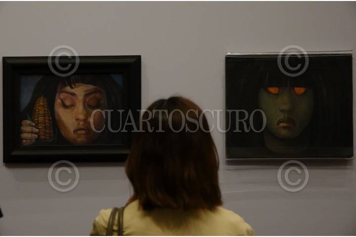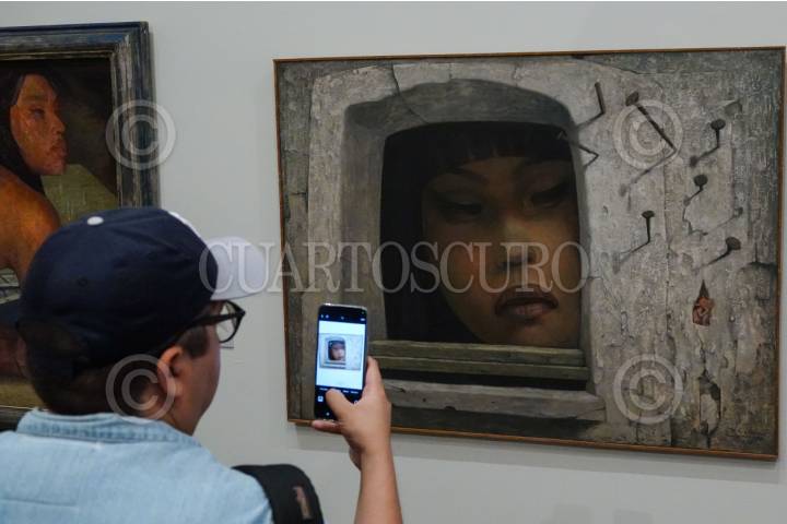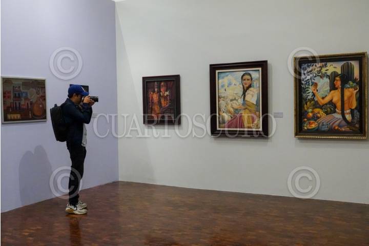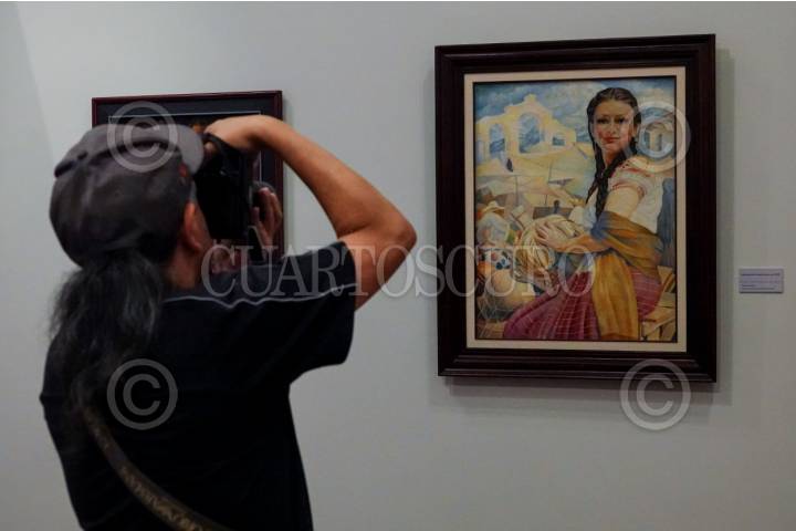 CIUDAD DE MÉXICO, 22MAYO2025.- Un reportero fotografía la obra “La Muchacha del diablillo” que integran la exposición "Jorge González Camarena. Más allá de la monumentalidad" que forma parte de un recorrido dual por el Museo Mural Diego Rivera y el Palacio de Bellas Artes con motivo del 45 aniversario de la muerte del artista.