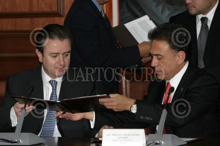 MÉXICO, D.F., 13DICIEMBRE2006.-Luis Peña Kegel, dierctor de Banorte y Miguel Angel Yunes Linares, director del ISSSTE, durante la firma de convenio entre el instituto y el Banorte en materia de créditos hipotecarios para sus derechohabientes. FOTO: MOISÉS PABLO/CUARTOSCURO.COM