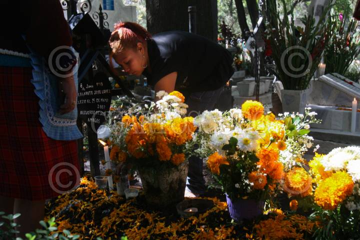 MÉXICO, D.F., 02NOVIEMBRE2010.- Una joven adorna con flores la tumba de uno de sus familiares que se encuentra en el Panteón de Jilotepec, en la delegación Xochimilco, donde cientos de personas acuden este Día de Muertos para acompañar a sus difuntos con un poco de música, comida y bebida. FOTO: ISAAC ESQUIVEL/CUARTOSCURO.COM