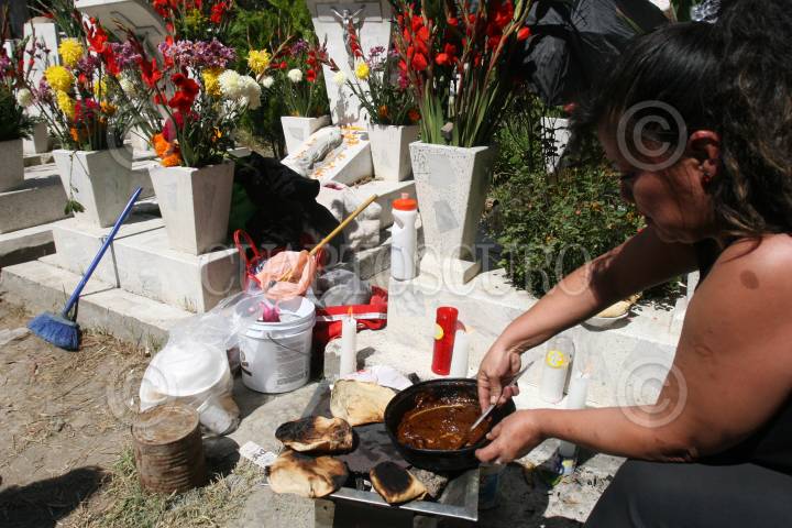 MÉXICO, D.F., 02NOVIEMBRE2010.- Una señora prepara un mole con tortillas para comer en la tumba de uno de sus familiares en el Panteón de Jilotepec, en la delegación Xochimilco, donde cientos de personas acuden este Día de Muertos para acompañar a sus difuntos con un poco de música, comida y bebida. FOTO: ISAAC ESQUIVEL/CUARTOSCURO.COM