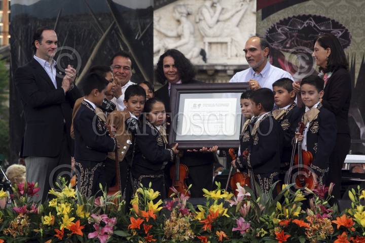 GUADALAJARA, JALISCO 02SEPTIEMBRE2012.- . La Presidenta del Consejo Nacional para la Cultura y las Artes (CONACULTA), Consuelo Sáizar, recibió el pergamino en el que se declara al Mariachi como Patrimonio Cultural Inmaterial de la Humanidad, por parte de la Organización de las Naciones Unidas para la Educación, la Ciencia y la Cultura (UNESCO) en la Plaza de la Liberación de esta ciudad. Le acompañaron el Secretario de Cultura del Estado, Alejandro Cravioto, así como el Presidente de la Cámara Nacional de Comercio de Guadalajara (CANACO), Francisco Beckmann. FOTO: FERNANDO CARRANZA GARCÍA/CUARTOSCURO.COM