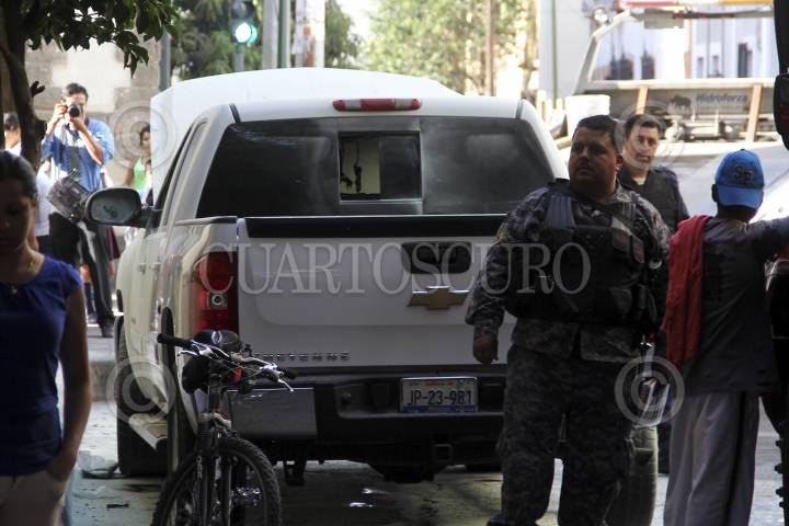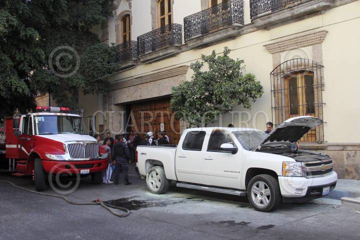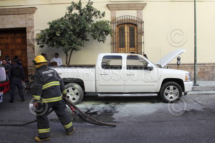 GUADALAJARA, JALISCO 17ABRIL2013.- Una camioneta pick up en color blanco fue incendiada esta tarde de manera premeditada, según testigos mencionan que dos personas rompieron el cristal del vehículo para después arrojar una bomba molotov. El hecho se registro, en la calle Liceo entre San Felipe y Reforma en pleno centro de la ciudad. De acuerdo con los reportes, la Cheyenne de modelo reciente con placas JP23981 estaba estacionada sobre la calle de Liceo, afuera de la Fundación Álvarez del Castillo. FOTO: FERNANDO CARRANZA GARCÍA /CUARTOSCURO.COM