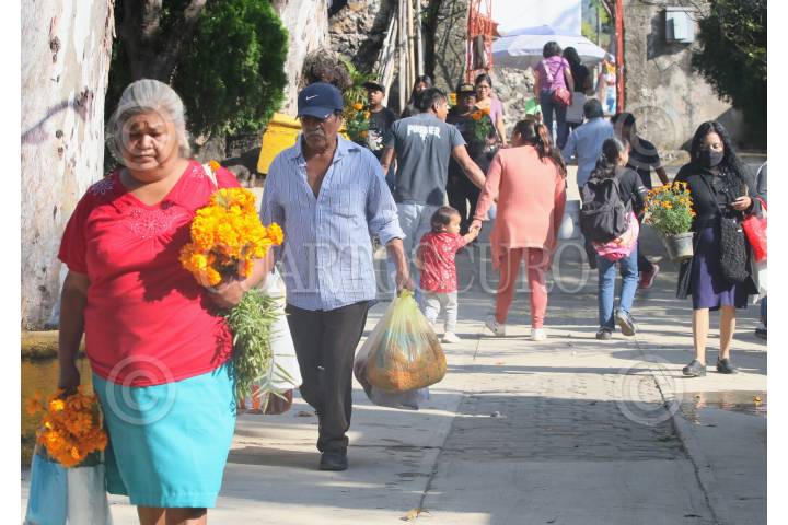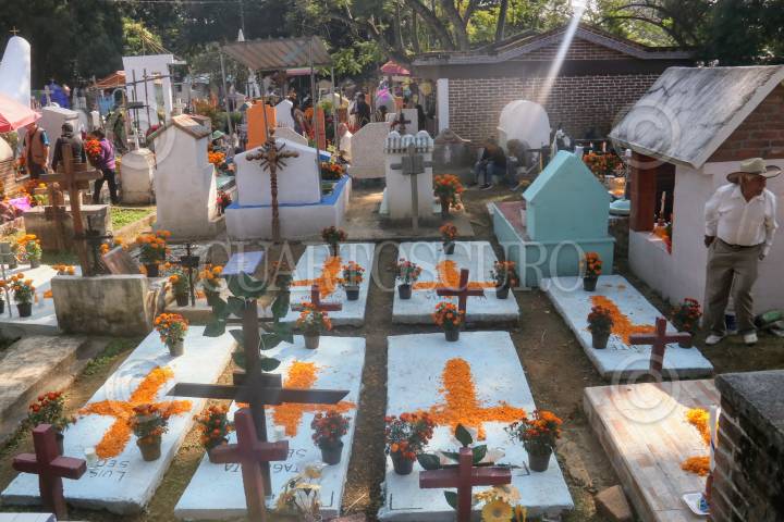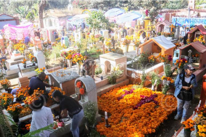 CUERNAVACA, MORELOS, 02NOVIEMBRE2024.- Cientos de católicos acuden este día a los panteones para limpiar y adornar las tumbas de sus familiares fallecidos y convivir en familia. En la imagen, habitantes de la comunidad indígena de Ocotepec visitan a sus fieles difuntos en el panteón comunal. FOTO: MARGARITO PÉREZ RETANA/ CUARTOSCURO.COM