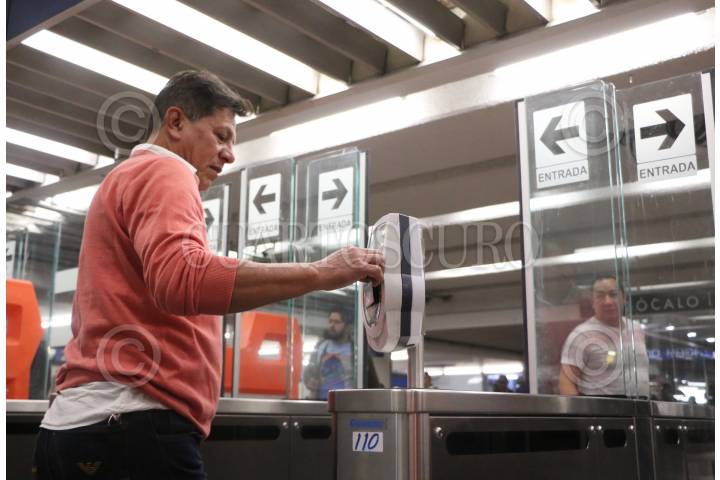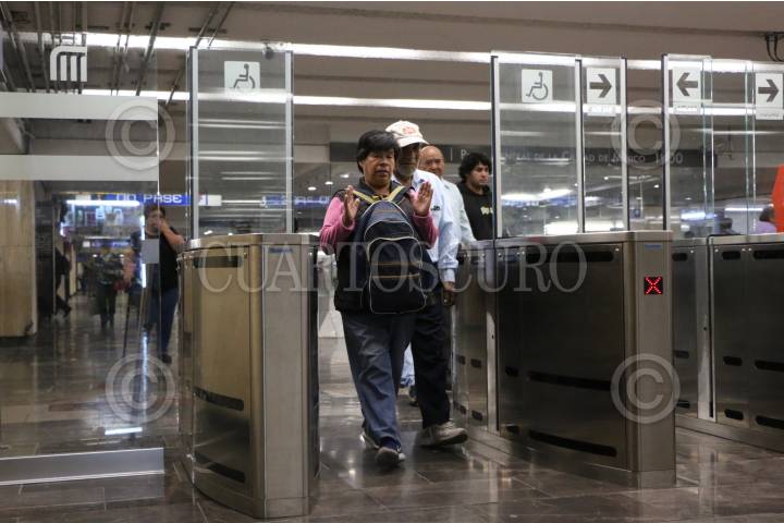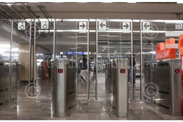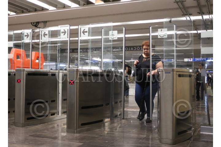 Usuarios del metro, utilizan las nuevas puertas de cristal retractles que remplazaran a los torniquetes en la estacin Zócalo.