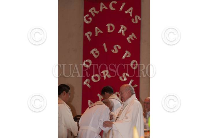 SAN CRISTOBAL ECATEPEC, ESTADO DE MÉXICO 18MAYO2012.- Onésimo Cepeda Silva primer Obispo de la diócesis de Ecatepec cumplió 75 años, edad obligatoria para jubilarse, por lo que su renuncia fué presentada por él y aceptada por Benedicto XVI. Hoy ofició su última misa como Obispo en funciones de la diócesis creada en 1995, con sede en la Catedral de Ecatepec, donde fue ovacionado por sus feligreses, algunos funcionarios locales y sacerdotes. Onésimo Cepeda es conocido por sus controvertidas declaraciones a favor de sus amistades políticas y con poder económico. Cepeda Silva anunció que viajará a Italia por lo menos ahora para descansar. Hoy sus fieles le organizaron una comida en su honor en la explanada municipal de Ecatepec. Al acto tambien asistieron seminaristas y monjas de diversas diócesis. FOTO: JUAN PABLO ZAMORA /CUARTOSCURO.COM