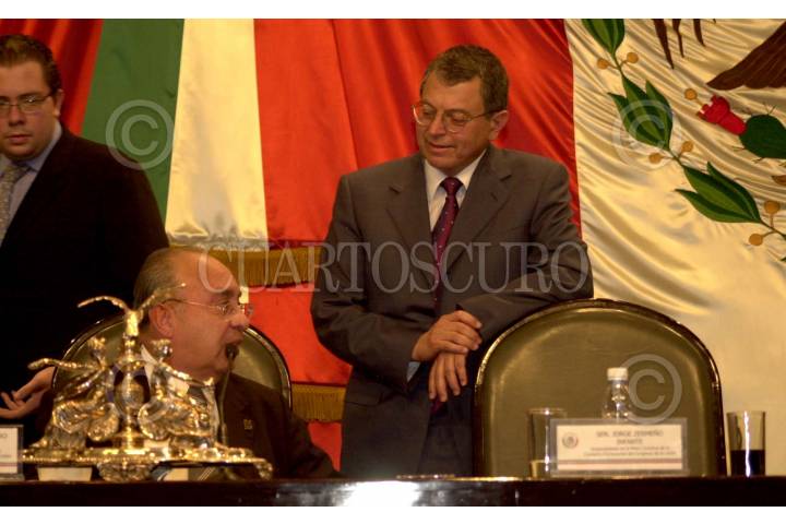 México, D.F. 11 FEBRERO 2004.- El senador Manuel Barttlet se despide del el del presidente de la CNDH, José Luis Soberanes, quien presentó su informe de actividades correspondiente al año 2003, ante la Comisión permanente del Congreso de la Unión. FOTO: Sandra Perdomo/CUARTOSCURO.COM