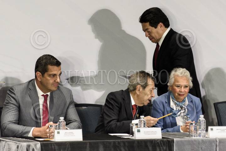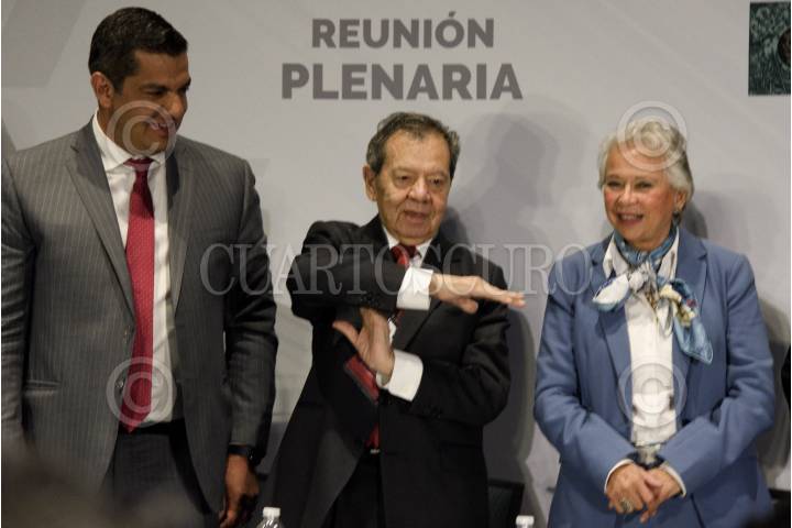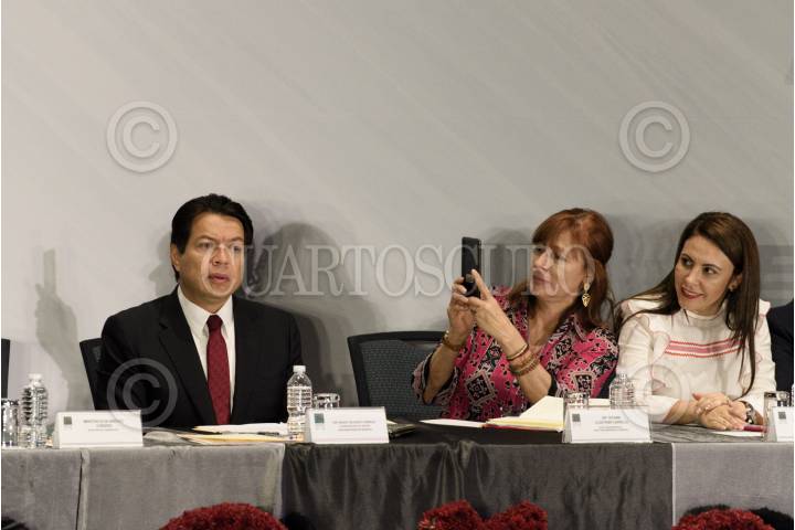 CIUDAD DE MÉXICO, 29AGOSTO2019.- Diputados del Grupo Parlamentario de Morena asistieron a la inauguración de la Reunión Plenaria en la que se definirá la agenda legislativa para el próximo 1 de septiembre. En la imagen, Ricardo Peralta Saucedo, subsecretario de Gobernación; Porfirio Muñoz Ledo, presidente de la mesa directiva de Diputados y Olga Sánchez Cordero, secretaria de Gobernación. FOTO: MARIO JASSO /CUARTOSCURO.COM