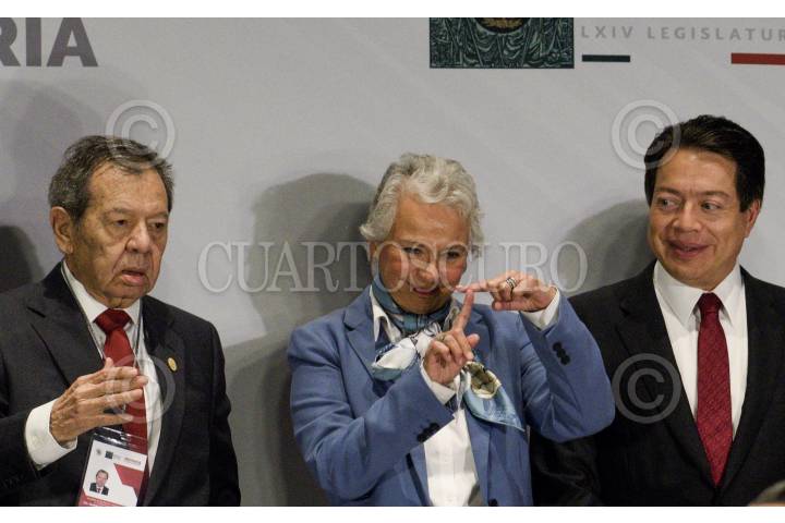 CIUDAD DE MÉXICO, 29AGOSTO2019.- Diputados del Grupo Parlamentario de Morena asistieron a la inauguración de la Reunión Plenaria en la que se definirá la agenda legislativa para el próximo 1 de septiembre. En la imagen, Porfirio Muñoz Ledo, presidente de la mesa directiva de en Diputados; Olga Sánchez Cordero, secretaria de Gobernación y Mario Delgado, coordinador de Morena en Diputados. FOTO: MARIO JASSO /CUARTOSCURO.COM
