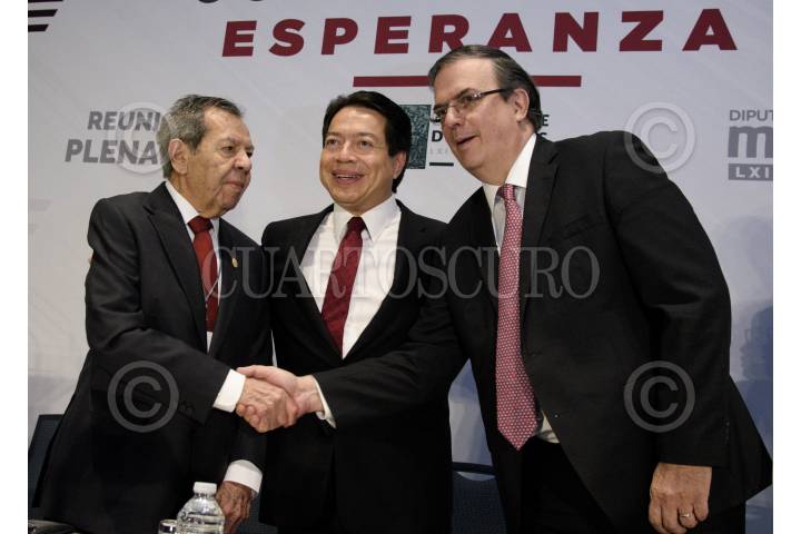 CIUDAD DE MÉXICO, 29AGOSTO2019.- Diputados del Grupo Parlamentario de Morena asistieron a la inauguración de la Reunión Plenaria en la que se definirá la agenda legislativa para el próximo 1 de septiembre. En la imagen, Porfirio Muñoz Ledo, presidente de la mesa directiva en Diputados; Mario Delgado, coordinador de Morena en diputados y Marcelo Ebrard, secretario de Relaciones Exteriores. FOTO: MARIO JASSO /CUARTOSCURO.COM