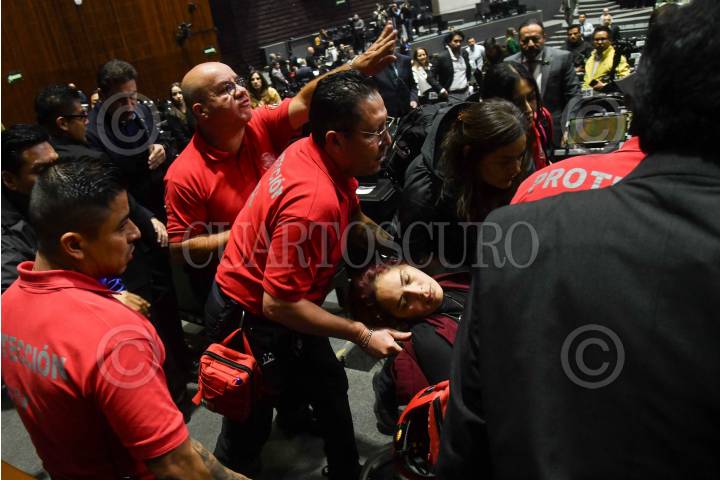CIUDAD DE MÉXICO, 10DICIEMBRE2024.- Cassandra de los Santos, diputada del Partido Verde Ecologista de México (PVEM) se desvaneció durante la sesión ordinaria de la Cámara de Diputados. La legisladora fue inmediatamente atendida por personal de protección civil, y recientemente fue reportada estable. FOTO: MARIO JASSO/CUARTOSCURO.COM
