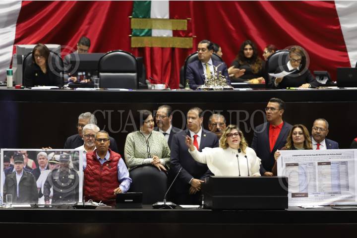 CIUDAD DE MÉXICO, 24JUNIO2025.- Lilia Aguilar, diputada del Partido del Trabajo, subió a tribuna para posicionarse a favor de que la Guardia Nacional pase a la Sedena y mostró una fotografía del ex presidente de México, Felipe Calderón, cuando se vistió con indumentaria militar. FOTO: DANIEL AUGUSTO/ CUARTOSCURO.COM