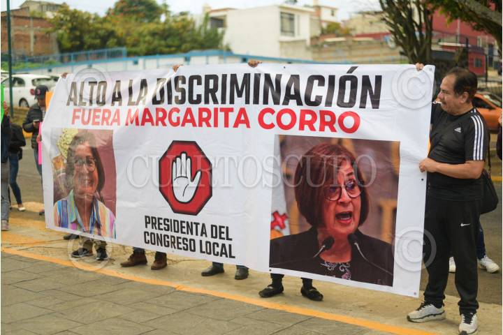 XALAPA, VERACRUZ, 04NOVIEMBRE2023.- Un grupo de personas se manifestó contra la ex presidenta de la mesa directiva del Congreso del Estado, Margarita Corro Mendoza: Le gritaron clasista y traidora. Con lonas y pancartas pidieron su renuncia afuera del recinto. Cabe recordar que en días anteriores, se filtró un video donde la diputada pide a un grupo de Indígenas qué le hablen en español. FOTO: YERANIA ROLÓN/CUARTOSCURO.COM