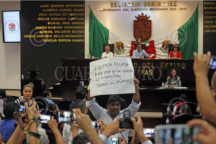 TUXTLA GUTIÉRREZ, CHIAPAS, 13JUNIO2017.- El periodista Silvano Bautista Arias acompañado de colegas irrumpieron la sesión ordinaria del Congreso del Estado, ante la demanda civil que le interpusiera la diputada local Maria de Jesús Olvera, por daño moral y reparación de daños por la cantidad de cinco millones de pesos, derivado de una nota publicada que la vincula con ocho averiguaciones previas. FOTO: JESÚS GARCÍA /CUARTOSCURO.COM