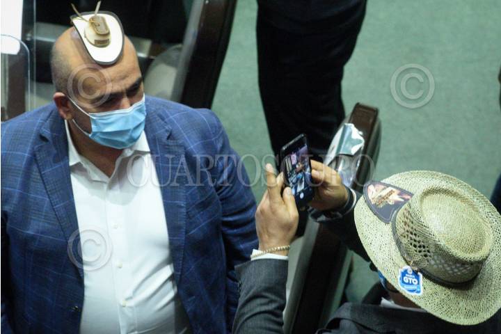 Jorge Arturo Espadas, diputado del PAN, se toma una fotografía con el pequeño sombrero que se colocó durante la sesión ordinaria de la Cámara de Diputados.