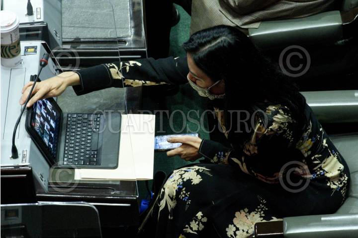 Isabel Margarita Guerra, diputada del PAN, conversa mediante videollamada con integrantes del grupo parlamentario del PAN durante la sesión semipresencial de la Cámara de Diputados.