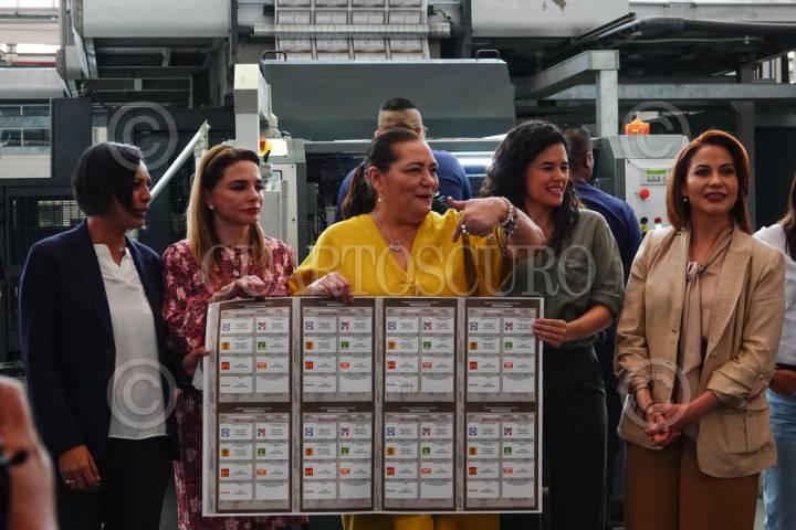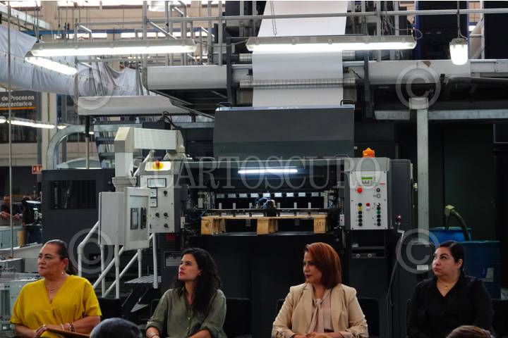 CIUDAD DE MÉXICO, 01MARZO2024.- Guadalupe Taddei consejera presidenta del INE, Luisa Maria Alcalde, secretaria de gobernación, Maribel Aguilera, directora general de Talleres Gráficos de México, encabezaron el inicio del ciclo de la producción de boletas electorales en los Talleres Gráficos de México. FOTOS: ROGELIO MORALES /CUARTOSCURO.COM