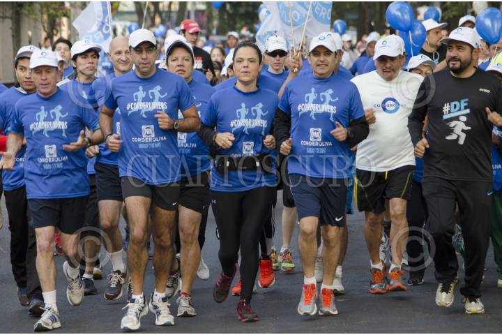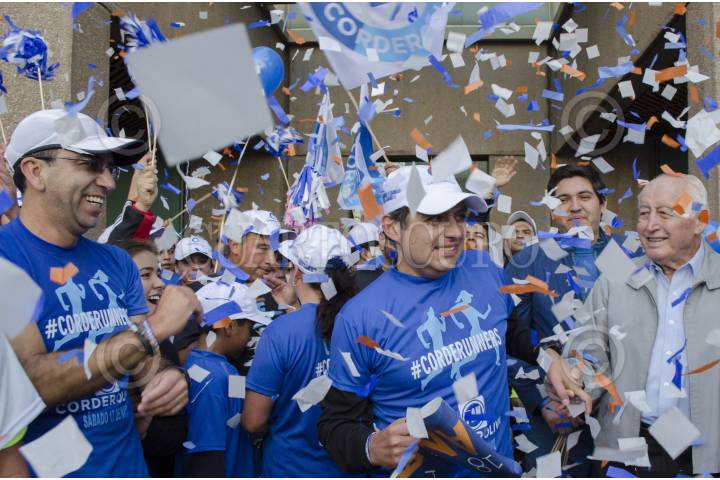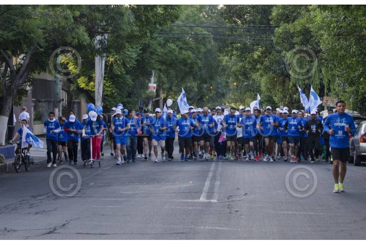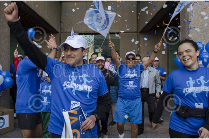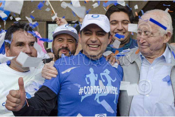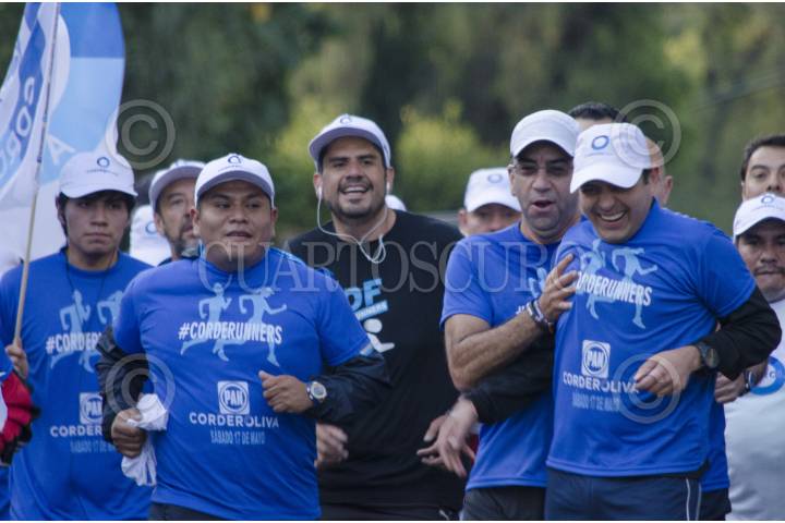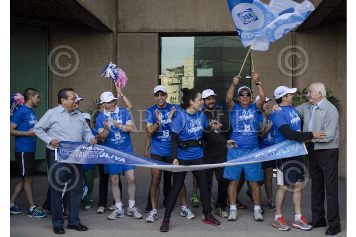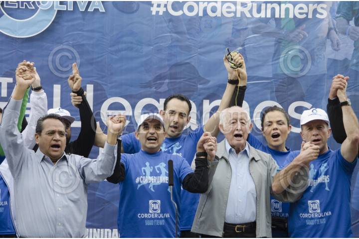 MÉXICO, D.F., 17MAYO2014.- Ernesto Cordero, candidato a la presidencia nacional del PAN, concluyó su campaña con una carrera que arrancó del monumento a Manuel Clouthier en Altavista, hasta la sede del partido ubicada en la colonia Del Valle; un total de 5 kilómetros. Luis H. Álvarez, uno de los líderes morales del panismo, esperó al candidato y a su caravana de “Corderorunners”, en las puertas de la sede, en donde Juan Manuel Oliva, candidato a secretario, también esperaba. Militantes del partido acudirán a votar el día de mañana de donde se elegirá al nuevo dirigente. El senador Cordero estuvo acompañado de los senadores Javier Lozano, Mariana Gómez del Campo y Roberto Gil Zuarth. “En la carrera de este domingo yo voy a llegar primero”, mencionó al arribar a la meta. FOTO: MARÍA JOSÉ MARTÍNEZ /CUARTOSCURO.COM