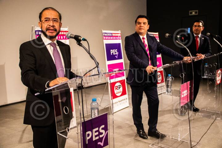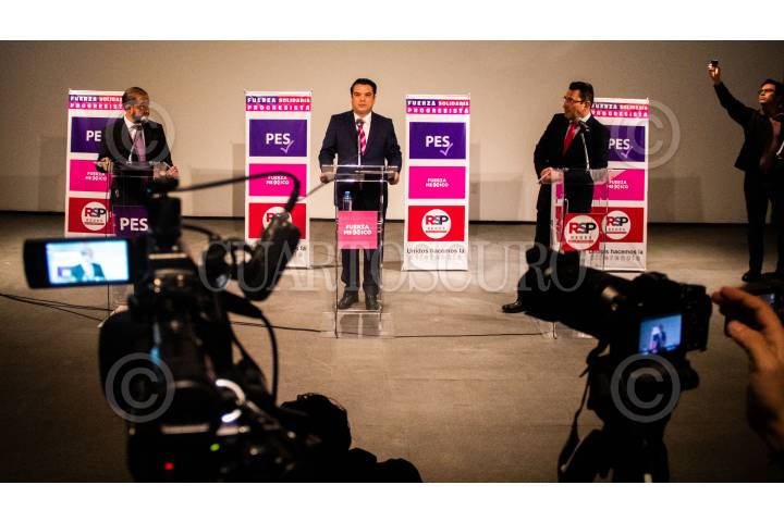 Hugo Eric Flores (PES), Gerardo Islas Fuerza México y Fernando González (RSP), en conferencia de prensa esta mañana.