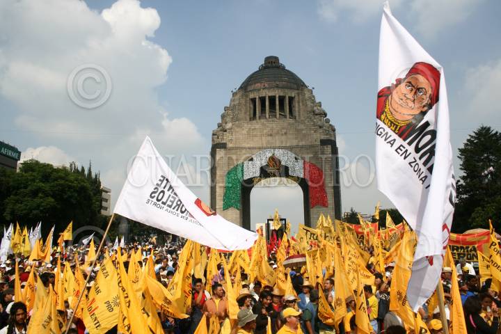 MÉXICO, D.F., 25AGOSTO2008.- Integrantes del FAP se dieron cita en el monumento a la revolución y marcharon por las principales calles del Centro Histórico, para dirigirse al senado de la republica donde entregaron su propuesta de reforma energética para su discusión en la Comisión permanente. FOTO: SÁSHENKA GUTIÉRREZ/CUARTOSCURO.COM