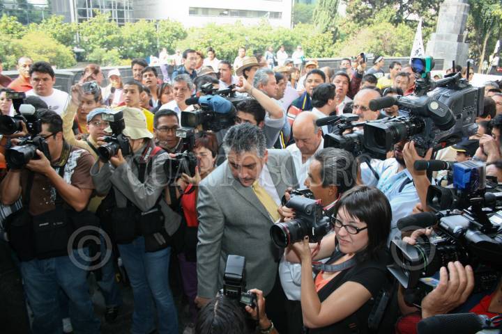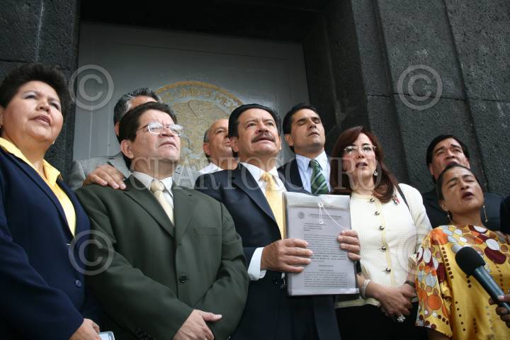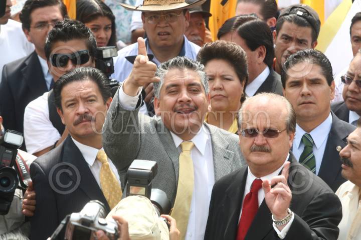 MÉXICO, D.F., 25AGOSTO2008.- Carlos Navarrete Coordinador de la bancada perredista en el senado de la república, Graco Ramírez y Jesus Ortega integrantes del FAP se dieron cita en el monumento a la revolución y marcharon por las principales calles del Centro Histórico, para dirigirse al senado de la republica donde entregaron su propuesta de reforma energética para su discusión en la Comisión permanente. FOTO: SÁSHENKA GUTIÉRREZ/CUARTOSCURO.COM