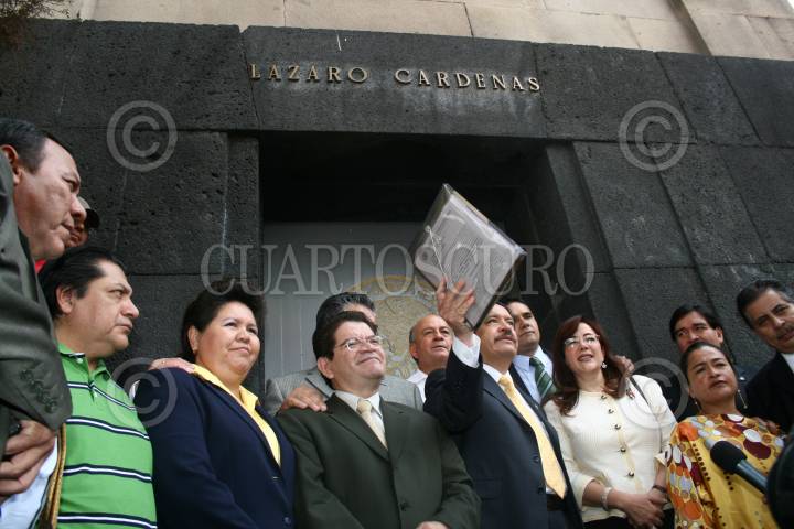 MÉXICO, D.F., 25AGOSTO2008.- Integrantes del FAP se dieron cita en el monumento a la revolución y marcharon por las principales calles del Centro Histórico, para dirigirse al senado de la republica donde entregaron su propuesta de reforma energética para su discusión en la Comisión permanente el coordinador de la bancada perredista del senado de la república Carlos navarrete muestra la propuesta de la reforma a los medios de comunicación. FOTO: SÁSHENKA GUTIÉRREZ/CUARTOSCURO.COM