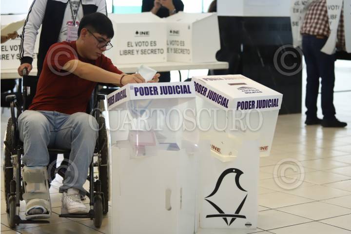 CIUDAD DE MÉXICO, 20MAYO2025.- Una persona en silla de ruedas participa en un ejercicio de votación en una casilla que estará enfocada en personas con alguna discapacidad. FOTO: DANIEL AUGUSTO/ CUARTOSCURO.COM