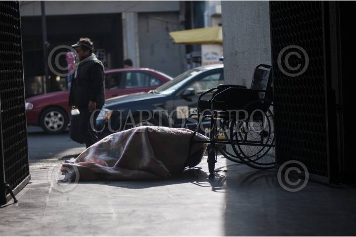 MÉXICO, D.F., 21OCTUBRE2014.- Postrado en su silla de ruedas, una persona en situación de calle duerme tapado con una cobija durante una mañana fría en la entrada del metro Guerrero. FOTO: DIEGO SIMÓN SÁNCHEZ /CUARTOSCURO.COM