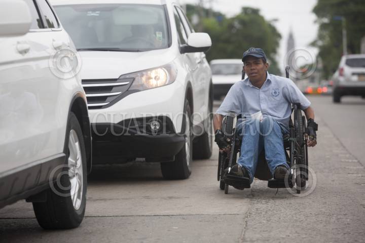 VILLAHERMOSA, TABASCO, 27NOVIEMBRE2014.- Un joven con discapacidad física y en su silla de ruedas se traslada sobre cinta asfáltica entre el trafico de la avenida Pages Llergo. FOTO: MARCO POLO GUZMÁN HERNÁNDEZ/CUARTOSCURO.COM