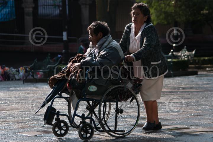 CIUDAD DE MÉXICO, 21SEPTIEMBRE2018.- Una señora camina con un señor en su silla de ruedas en el jardín Hidalgo del centro de Coyoacán durante las primeras horas del día. FOTO: DIEGO SIMÓN SÁNCHEZ /CUARTOSCURO.COM