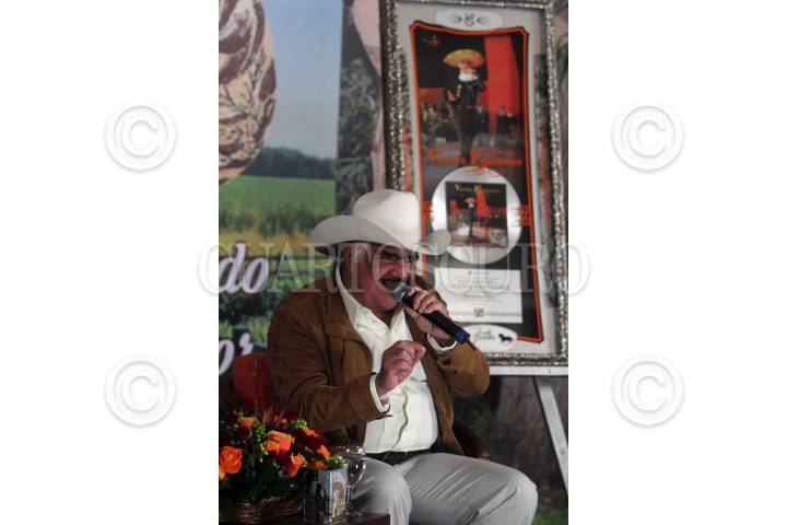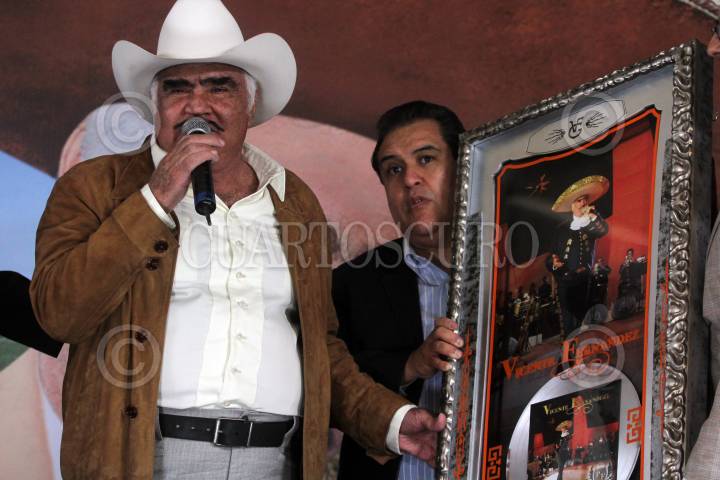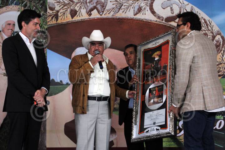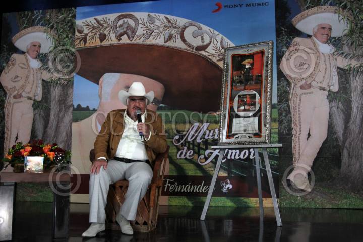 TLAJOMULCO DE ZUÑIGA, JALISCO. 07OCTUBRE2015.- Vicente Fernández, durante la presentación de su mas reciente disco “Muriendo de Amor” que se estrena a nivel internacional el próximo 9 de octubre, dicho evento se llevo a cabo en la Arena VFG, en donde también recibió un disco diamante por las 400 mil copias vendidas de su álbum y en donde comento que quedan un par de presentaciones mas para decir adiós definitivo y para una de estas esta contemplando el Estadio Azteca. FOTO: FERNANDO CARRANZA GARCIA / CUARTOSCURO.COM