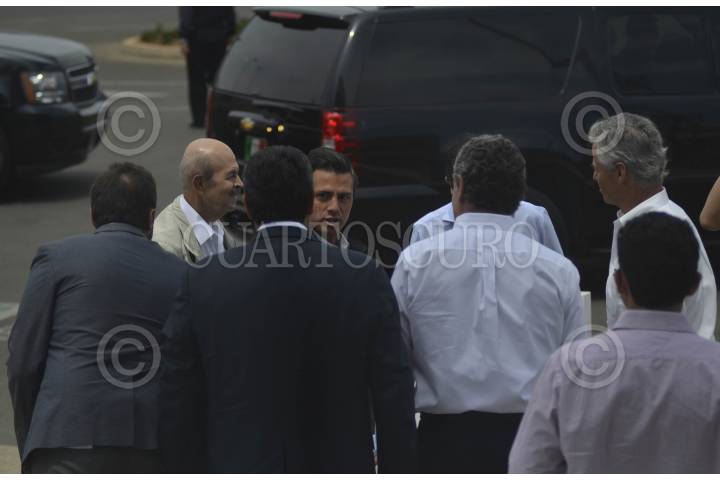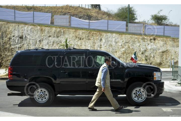 MORELIA, MICHOACÁN, 08ABRIL2014.- Personal del Estado Mayor Presidencial cuidan la camioneta donde viaja el presidente de México, a su llegada a la inauguración del centro de atención telefónica Dish. FOTO ALAN ORTEGA /CUARTOSCURO.COM