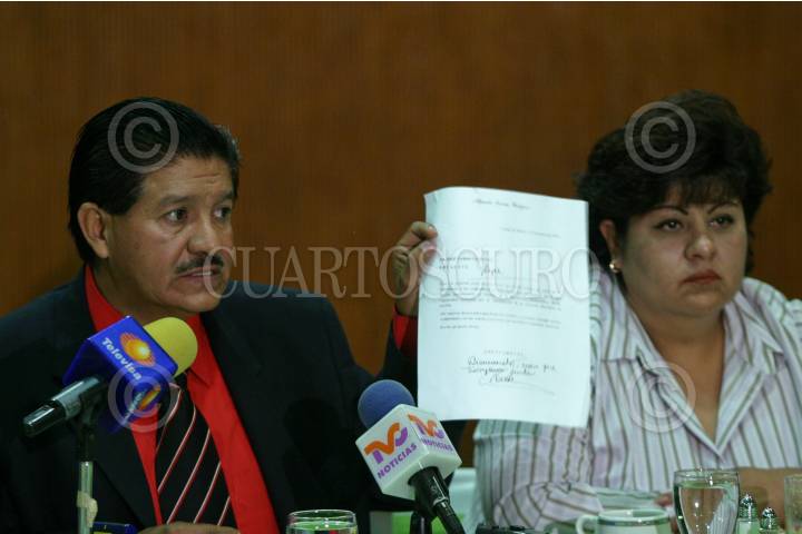MÉXICO D.F., 29ENERO2009.- Héctor Yescas, ex dirigente del PT capitalino; y Ángeles Torres de Magadalena Contreras durante una conferencia de prensa de la corriente disidente del Partido del Trabajo, Unidad Democrática Nacional en donde anunciaron que se presentará el próximo miércoles ante la Procuraduría General de la República una denuncia judicial en contra del dirigente nacional del PT, Alberto Anaya, por presunto lavado de dinero y/o malversación de recursos públicos. FOTO: RODOLFO ANGULO/CUARTOSCURO.COM