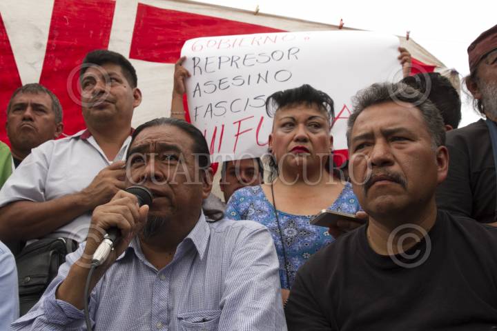 CIUDAD DE MÉXICO, 12JUNIO2016.- El integrante de la Ceteg Reyes Ramos Guerrero, durante la conferencia de prensa que ofrecieron los maestros disidentes en el plantón que mantienen en la Ciudadela, para hablar de la detención de los líderes de la sección 22; Rubén Núñez y Francisco Villalobos Ricárdez. FOTO: MOISÉS PABLO /CUARTOSCURO.COM
