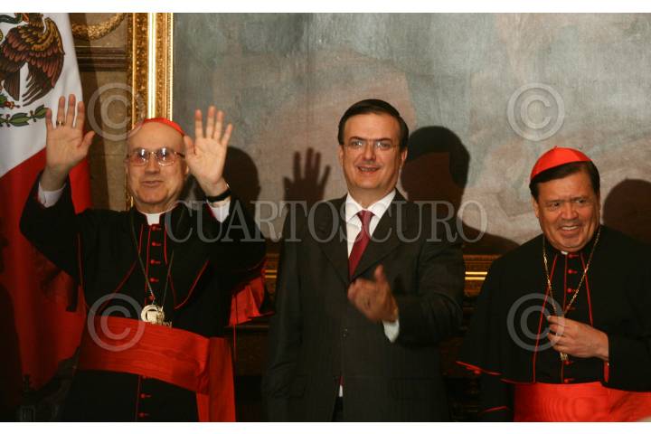 MÉXICO, D.F., 20ENERO2009.- El secretario de Estado Vaticano cardenal Tarcisio Bertone Marcelo Ebrard Jefe de Gobierno, y el Cardenal Norberto Rivera se despiden de los medios de comunicación, después de que Marcelo Ebrard entregara al representante del Vaticano la Declaratoria de Huésped Distinguido FOTO: SÁSHENKA GUTIÉRREZ/CUARTOSCURO.COM