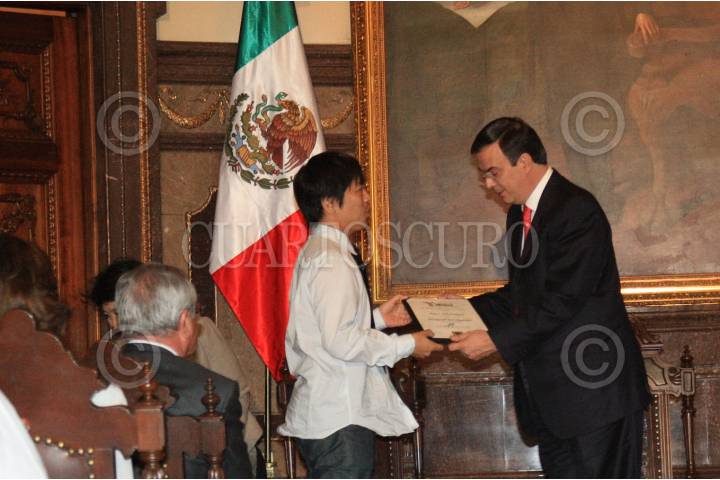 MÉXICO D.F., 06AGOSTO2009.- Marcelo Ebrad Casaubon, jefe del gobierno del D.F. entrego el certificado de huésped distinguido de la Ciudad de México al Arquitecto de origen Japonés Reyu Nishizawa, esto en las instalaciones del gobierno capitalino. FOTO: IVAN MENDEZ /CUARTOSCURO.COM