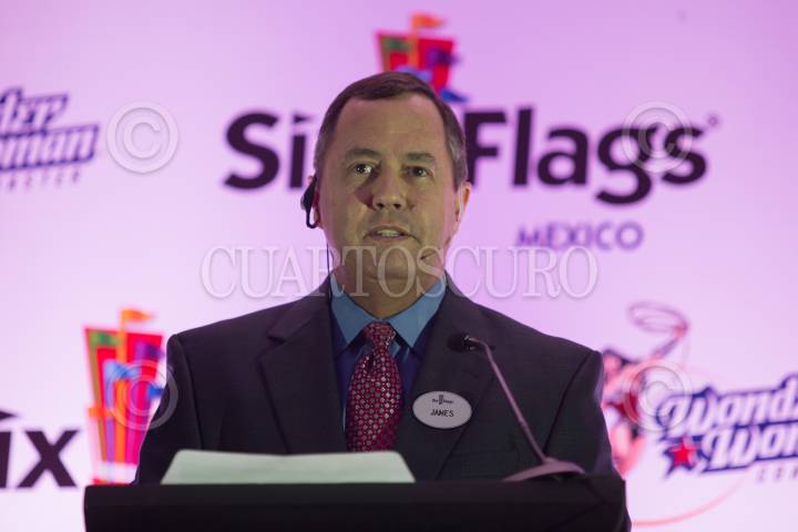 CIUDAD DE MÉXICO, 31AGOSTO2017.- James Geiser, vicepresidente de Mercadotecnia y Ventas de Six Flags Corporation, durante la conferencia en donde presentaron la nueva montaña rusa para el 2018, de diseño único y basada en la superheroína "Wonder Woman". FOTO: ADOLFO VLADIMIR /CUARTOSCURO.COM