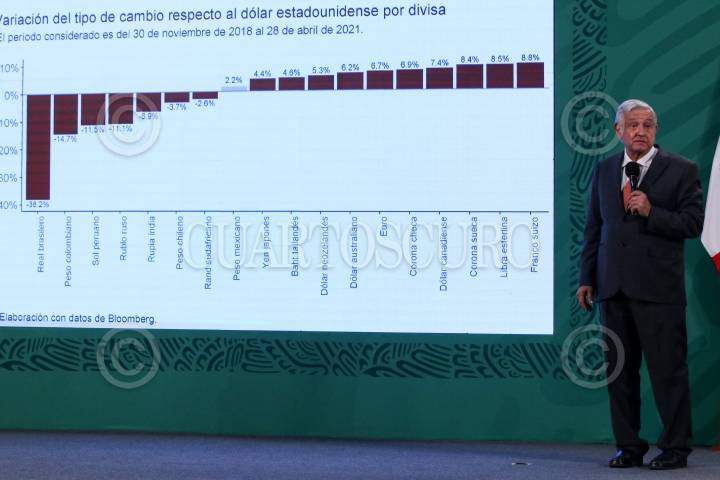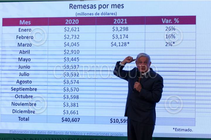 Andrés Manuel López Obrador durante la conferencia mañanera donde presentó una gráfica con la llegada de remesas a territorio nacional, las cuales bateran récord este año, aseguró el mandatario.