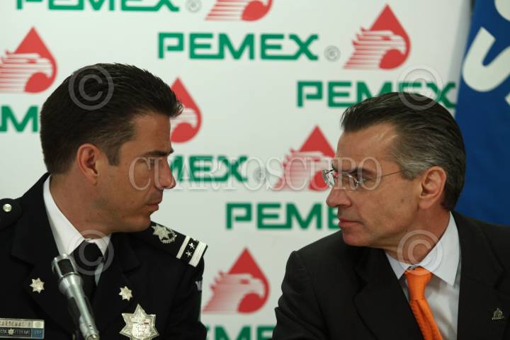 MÉXICO, D. F., 16MARZO2011.- Luis Cárdenas Palomino, titula de la división de Seguridad Regional de la Secretaría de Seguridad Pública federal y Juan José Suárez Coppel, director general de Petróleos Mexicanos (PEMEX) durante una rueda de prensa que se realizo hoy en la sede de la paraestatal. FOTO: RODOLFO ANGULO/CUARTOSCURO.COM