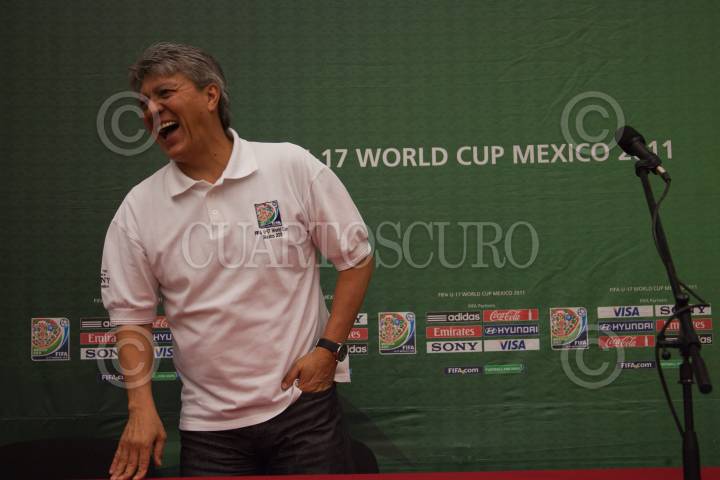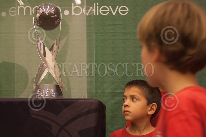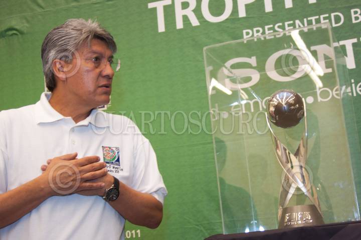 QUERÉTARO, QUERÉTARO, 12ABRIL2011.- La copa del Mundial de futbol Sub 17, visitó la capital del estado que será sede de la justa mundialista. En la presentación, estuvo el mexicano Jesús "Chucho" Ramírez, ex técnico mundialista que ha dirigido también al equipo de primera división Club América. FOTO: DEMIAN CHÁVEZ/CUARTOSCURO.COM
