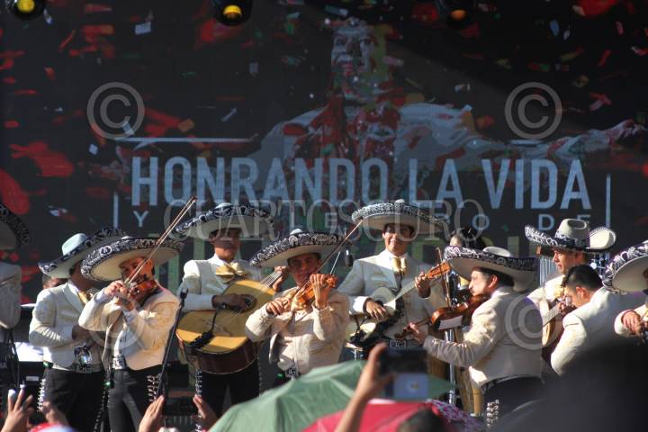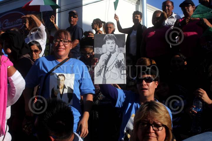 CIUDAD JUÁREZ, CHIHUAHUA, 28AGOSTO2017.- Grupos de mariachis, automóviles oldies, porristas, bailarines profesionales, rondallas, payasos, brake dance y botargas se integraron a la fiesta dedicada a la memoria del cantautor Juan Gabriel, quien siempre llevó a Juárez en sus canciones y conciertos, poniendo en alto el nombre de esta tierra que le vio nacer como artista. Juarenses y visitantes de otros estados aplauden y corean la música de la banda del municipio, cuyos integrantes tocaron la música del cantautor. FOTO: NACHO RUIZ /CUARTOSCURO.COM
